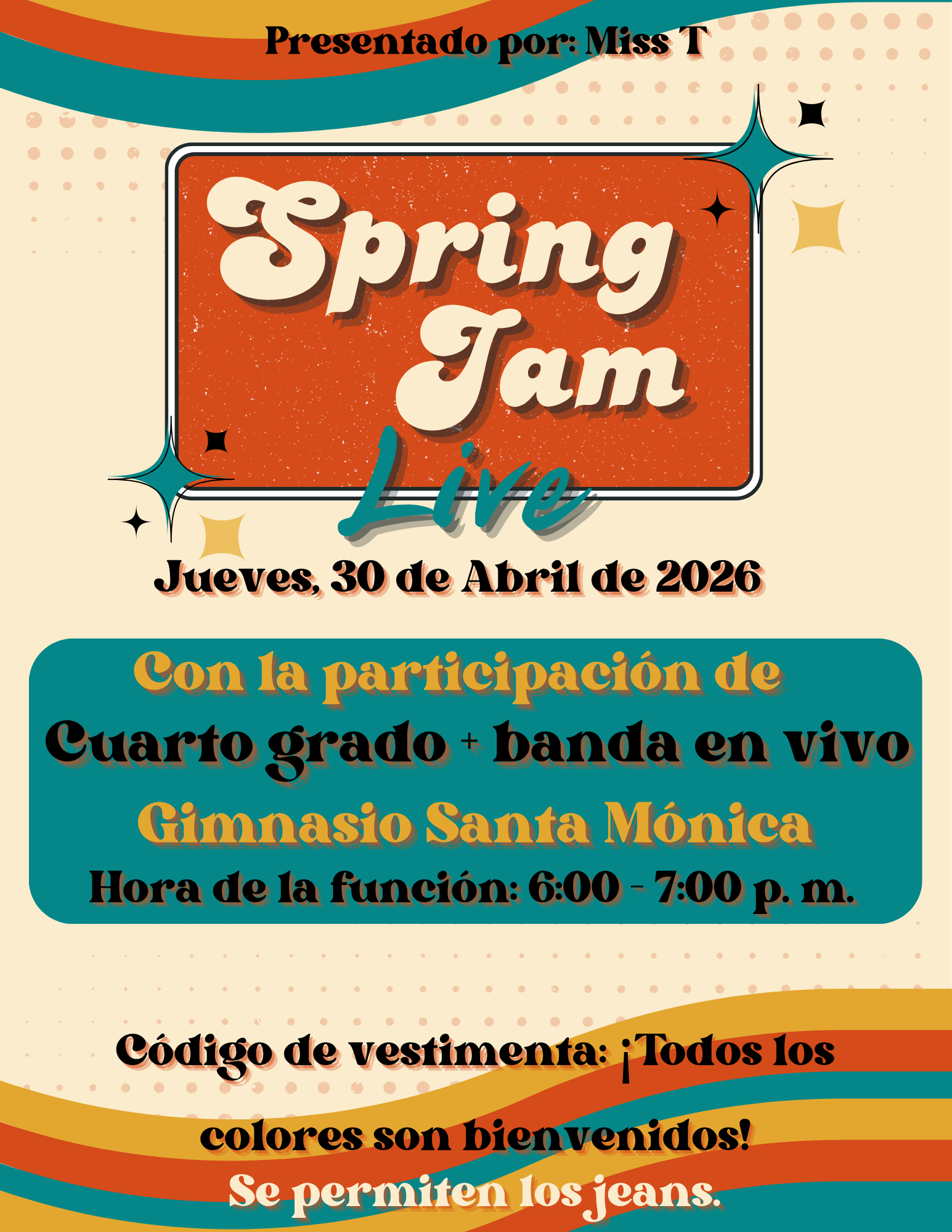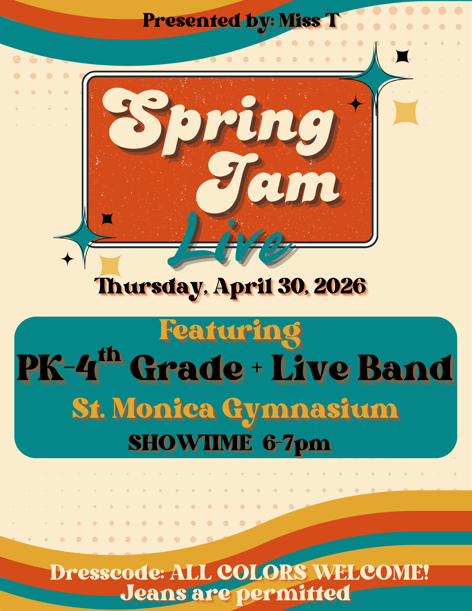 We would like to invite you all to our FIRST ever PK-4th grade SPRING JAM! This year we will be featuring our kiddos with a LIVE BAND!
