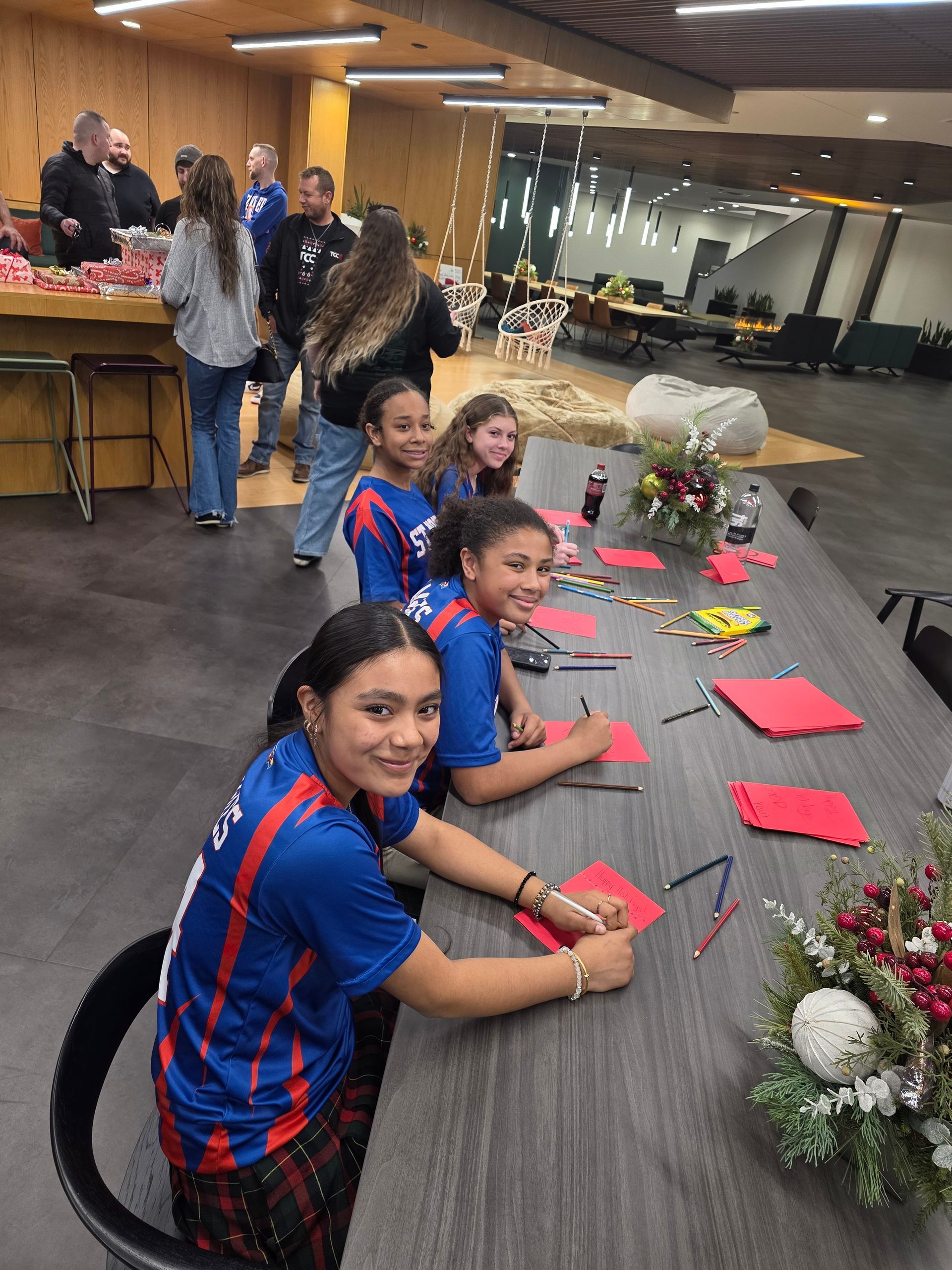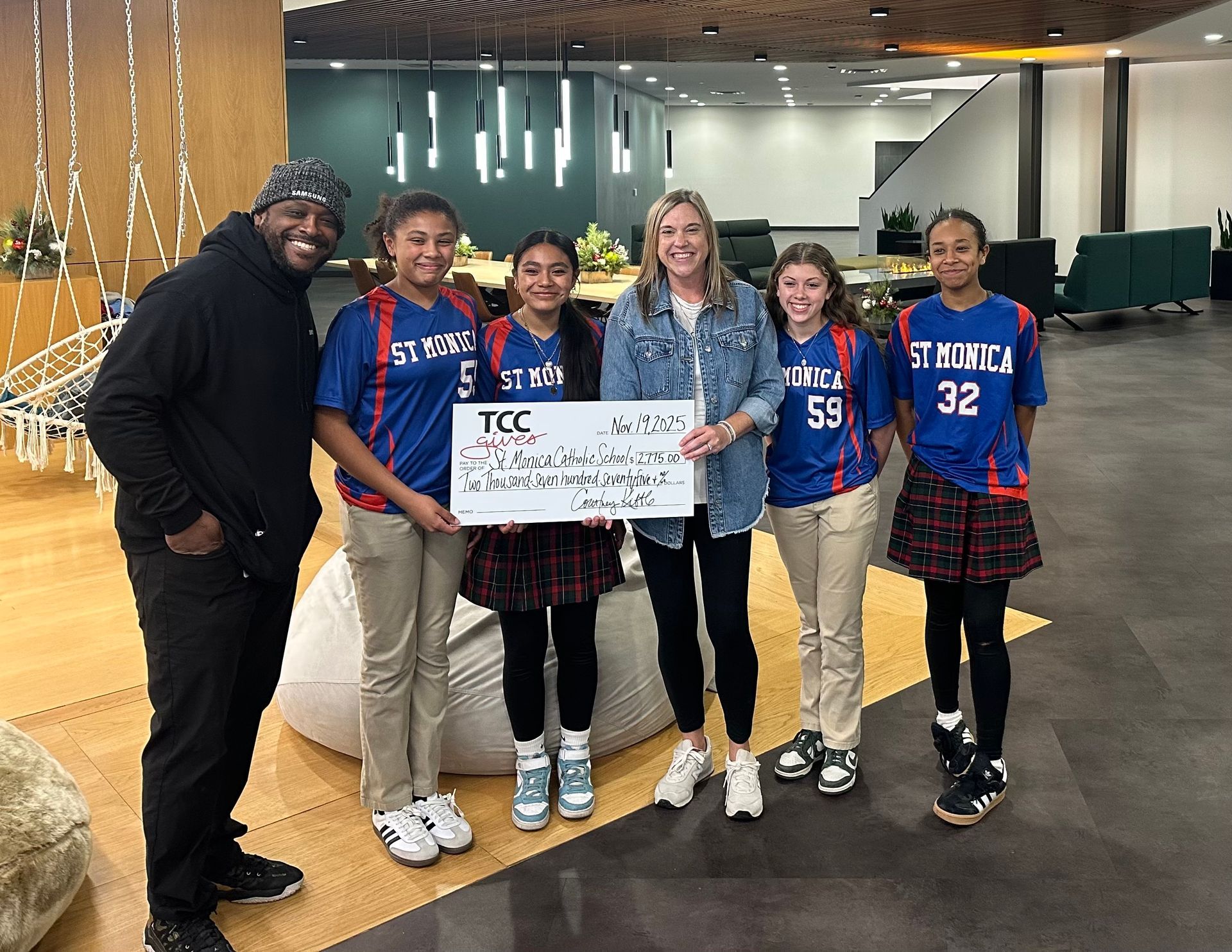 TCC sponsors a Soldiers Angel program where they provide presents for soldiers overseas. Some of Coach Clay's volleyball players volunteered wrapping presents and making cards at this event. TCC Gives presented St. Monica with a generous donation for Coach Clay's involvement with the company.