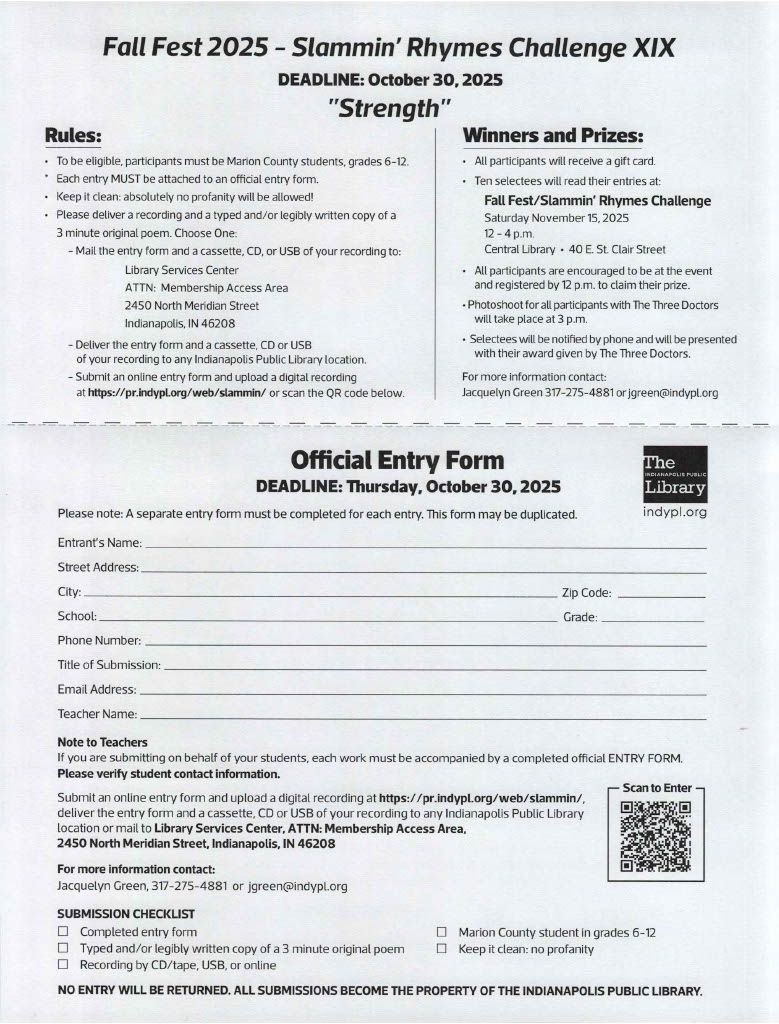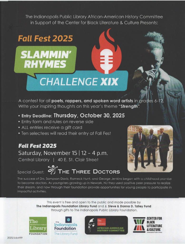 IndyPL’s Fall Fest Slammin’ Rhymes Challenge is coming up on Saturday, November 15th at Central Library. This contest is for poets, rappers, and spoken word artists in grades 6-12 and the theme this year is ‘Strength.’ This is a great opportunity for students to share their work with a broader audience, and all entries will receive a gift card for their participation. The deadline for entry is Thursday, October 30th, 2025.
